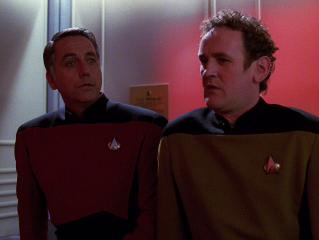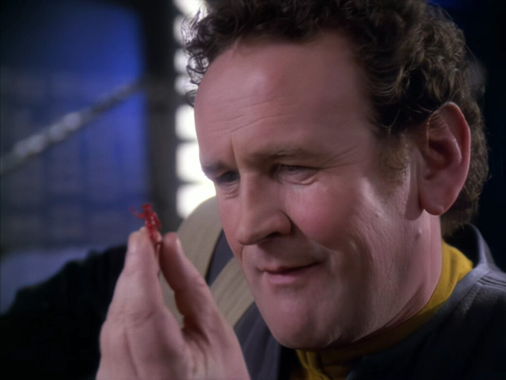 One of my favorite moments comes right at the start. Chief O’Brien has packed up and is about to leave his quarters for the final time when he spots something on the ground. As he picks up the lone army figure he and Dr. Bashir had been using in their Alamo recreation, McCarthy brings back strains from “The Minstrel Boy,” the song sung by O’Brien and Captain Maxwell way back in TNG’s “The Wounded.”