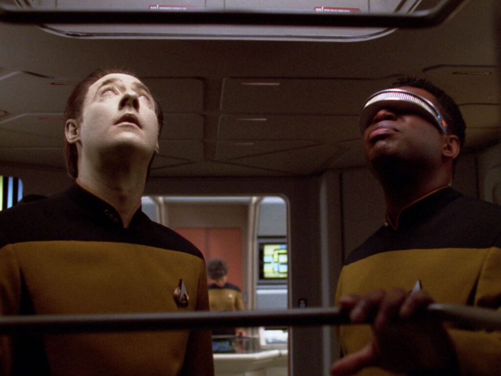 Darren has taken them to a spot in one of the Jeffries Tubes where the acoustics are apparently perfect, and she has also brought along a roll-up piano2. After Picard plays the flute melody for her, Darren begins to play a piano accompaniment along with him. In a particularly cute moment, the music is shown to be traveling around the ship, and Geordi and Data both go off in search of the source.