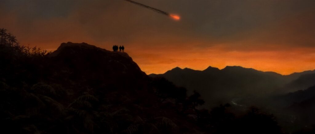 The music quiets with sustained string notes becoming more and more dissonant as the countdown approaches zero. The actual destruction of Enterprise, while hard to hear over the sound effects, is scored by rumbling piano and thunder sheet; the full orchestra returns with rolling tympani as what remains of the ship enters the atmosphere of the Genesis Planet and burns up as our crew watches.