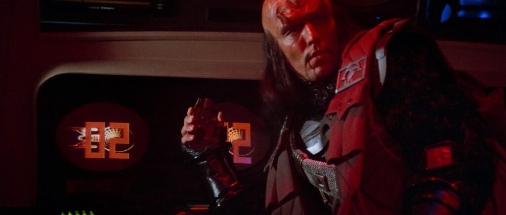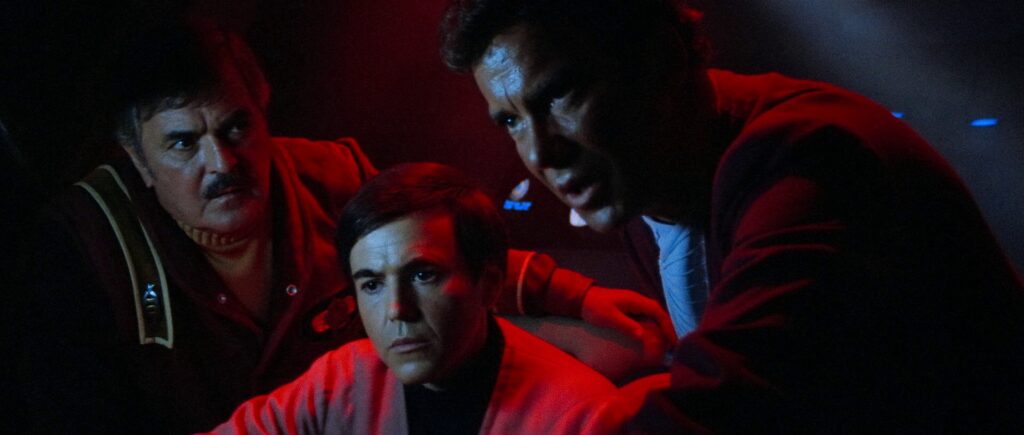 Kirk’s theme comes in once again as he and the others beam off the ship just before Torg and his men materialize on the transporter pad. Swirling Klingon horns play over their walk through the ship and arrival on the bridge.