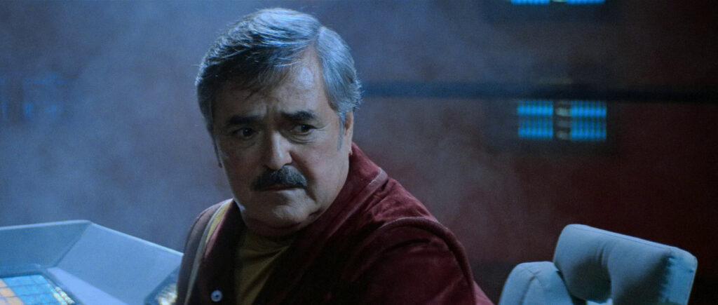 In one of the most affecting moments in the Star Trek films, and one of Shatner’s best acting moments in the franchise, Admiral Kirk reacts to the news that the Klingons on the Genesis Planet have just killed his son, David. Kirk stumbles back towards the captain’s chair only to miss and fall to the deck, his reaction running the gamut from disbelief, grief, and anger.